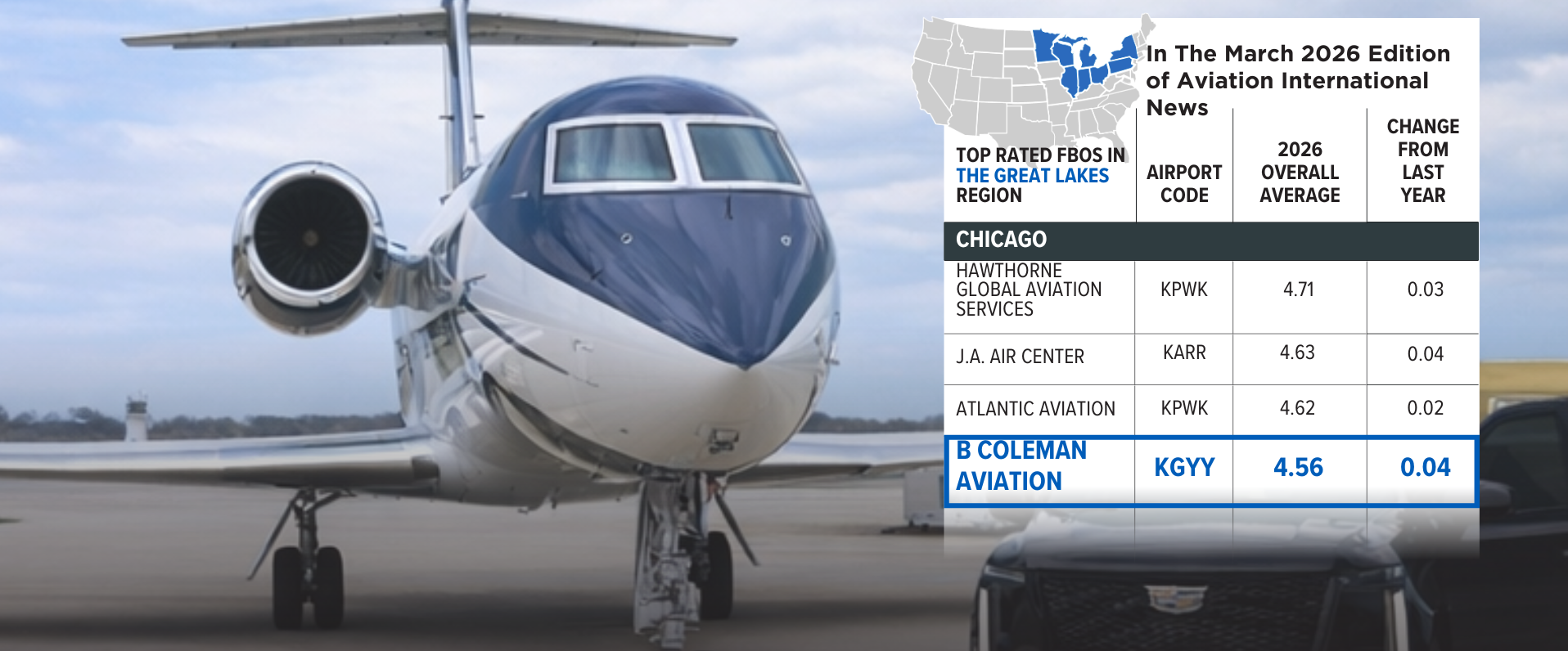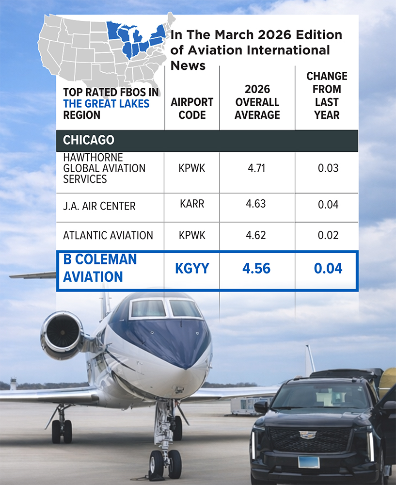 AIN has once again ranked B. Coleman Aviation among Chicago’s top FBOs: Thanks to our exceptional facilities, premium services, and unwavering commitment to every guest and flight.